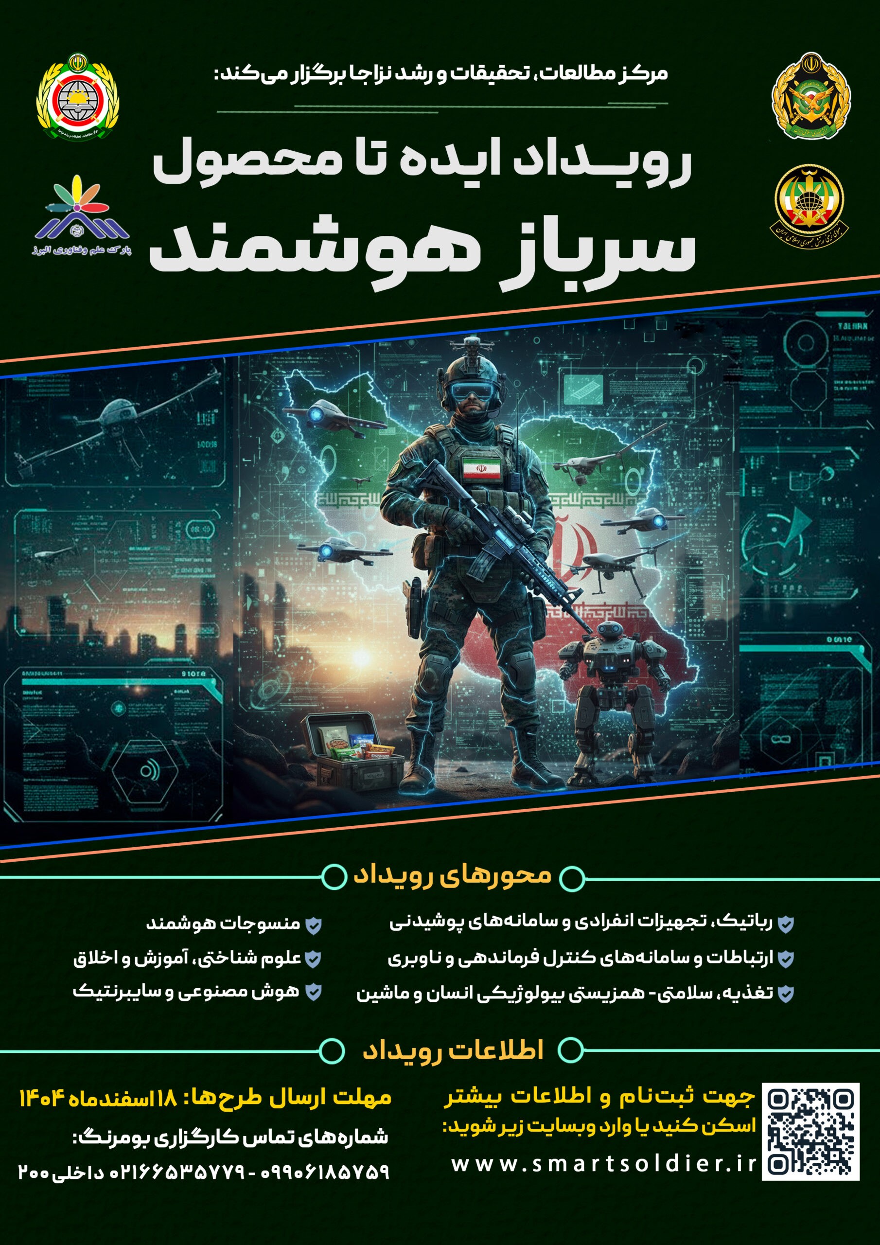 رویداد از ایده تا محصول سرباز هوشمند، رویدادی تخصصی با هدف اصلی تجاریسازی و توسعه ایدههای نوآورانه در حوزه فناوریهای نوین نظامی است. این رویداد با تمرکز بر محورهای کلیدی چون رباتیک، تجهیزات انفرادی و سامانههای پوشیدنی، منسوجات هوشمند، ارتباطات و سامانههای کنترل فرماندهی و ناوبری، علوم شناختی، آموزش و اخلاق، تغذیه، سلامتی- همزیستی بیولوژیکی انسان و ماشین و همچنین هوشمصنوعی و سایبرنتیک، فضایی پویا برای همافزایی میان ایدهپردازان، متخصصان و صنعتگران فراهم میآورد.
